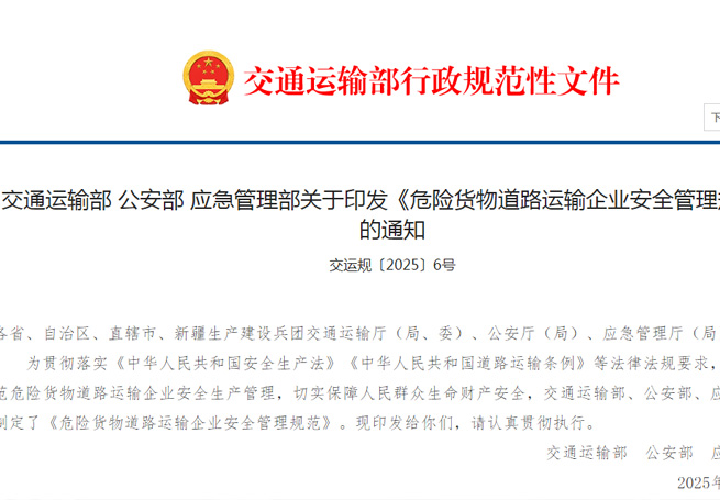 交通部通知近日,交通運輸部會同公安部、應(yīng)急管理部發(fā)布了《危險貨物道路運輸企業(yè)安全管理規(guī)范》(交運規(guī)〔2025〕6號,以下簡稱《規(guī)范》),自印發(fā)之日起施行。一、制定背景近年來,危險貨物道路運輸重特大安全生產(chǎn)事故雖得到初步遏制,但一般及以下事故仍多發(fā)頻發(fā),暴露出行業(yè)安全管理還存在問題...