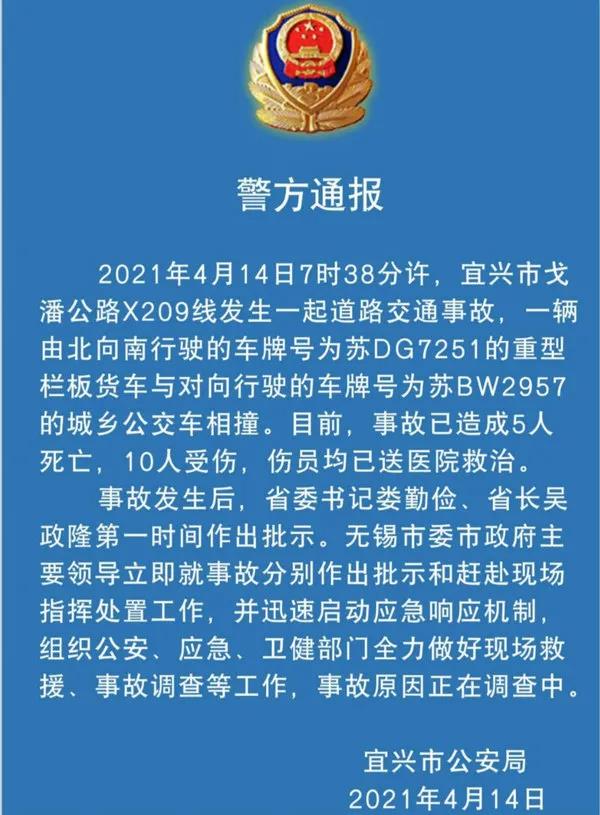沈海高速大貨車與大客車相撞致11死事故才過去沒多久,4月14日,江蘇發(fā)生一起慘痛事故,一公交車與半掛車相撞,導(dǎo)致5死10傷!愿逝者安息! 據(jù)新華網(wǎng)消息,從江蘇省應(yīng)急管理廳獲悉,14日上午7時(shí)45分,江蘇省宜興市徐舍鎮(zhèn)往楊港鎮(zhèn)方向一輛中巴車與貨車相撞,截至目前導(dǎo)致5死10傷。 據(jù)央視新聞報(bào)道稱,事故發(fā)生時(shí)公交車與貨車迎面撞上,貨車部件直插公交車內(nèi),車內(nèi)狼藉一片。傷員已被送到宜興當(dāng)?shù)蒯t(yī)院救治。目前事故原因正進(jìn)一步調(diào)查中。 關(guān)于事故最新通報(bào)消息來了: 據(jù)江蘇省宜興市公安局官方微信消息,4月14日7時(shí)38分許,宜興市戈潘公路X209線發(fā)生一起道路交通事故,一輛由北向南行駛的車牌號(hào)為蘇DG7251的重型欄板貨車與對(duì)向行駛的車牌號(hào)為蘇BW2957的城鄉(xiāng)公交車相撞。 目前,事故已造成5人死亡,10人傷,傷員均已送醫(yī)院救治。