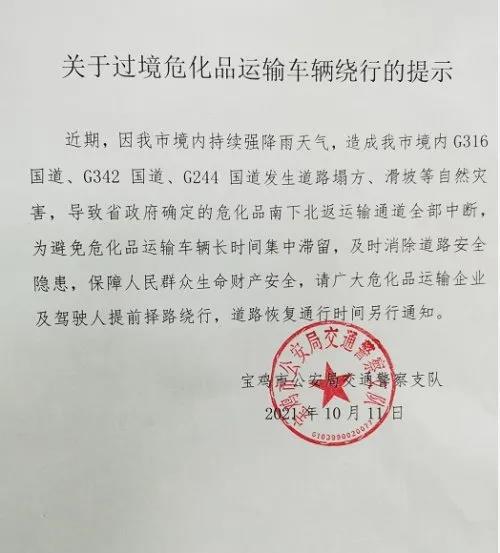 近期,因?qū)氹u市境內(nèi)持續(xù)強(qiáng)降雨天氣,造成寶雞市境內(nèi)G316國道、G342國道、G244國道發(fā)生道路塌方、滑坡等自然災(zāi)害,導(dǎo)致省政府確定的;纺舷卤狈颠\(yùn)輸通道全部中斷,為避免;愤\(yùn)輸車輛長時間集中滯留,及時消除道路安全隱患,保障人民群眾生命財產(chǎn)安全。 請廣大;愤\(yùn)輸企業(yè)及駕駛?cè)颂崆皳衤防@行,道路恢復(fù)通行時間另行通知。 陜西其他限行措施: G85銀昆高速寶雞南互通立交至田壩樞紐立交段限行 為進(jìn)一步加強(qiáng);返缆愤\(yùn)輸安全管理,防范化解交通安全風(fēng)險隱患,保障人民群眾生命、財產(chǎn)安全,全力預(yù)防;愤\(yùn)輸車輛道路交通事故,依據(jù)《中華人民道路交通安全法》《危險貨物道路運(yùn)輸安全管理辦法》等有關(guān)法律、行政法規(guī)。結(jié)合道路實際,經(jīng)研究決定,禁止;愤\(yùn)輸車輛通行G85銀昆高速寶雞南互通立交(K601+000)至田壩樞紐立交(K649+100)段道路(隧道群),F(xiàn)將有關(guān)事項通告如下: 一、限行車輛 ;愤\(yùn)輸車輛。 二、限行路段 G85銀昆高速寶雞南互通立交(K601+000)至田壩樞紐立交(K649+100)段道路。 三、限行時間 10月8日起全天24小時禁止;愤\(yùn)輸車輛通行。 四、繞行路線 (一)連霍高速甘肅天水和楊凌方向及G85銀昆高速平?jīng)龇较騺碥,?jīng)潘家灣樞紐立交駛?cè)隚85銀昆高速至寶雞南出口駛出,經(jīng)高速公路引線駛?cè)隨219省道。 (二)漢中方向來車,經(jīng)G244國道潘太公路通行、禁止駛?cè)隚85銀昆高速。 (三)過境危化品運(yùn)輸車輛嚴(yán)禁駛?cè)雽氹u市區(qū)道路。 陜西殘?zhí)貖W會期間限行 殘?zhí)貖W會賽事期間對陜西省境內(nèi);愤\(yùn)輸車輛實施交通管制,具體通告如下: 劇毒化學(xué)品車輛 2021年10月18日00:00——30日24:00 全省境內(nèi)禁止劇毒化學(xué)品運(yùn)輸車輛通行。 ;愤\(yùn)輸車輛 2021年10月20日00:00——24日24:00 2021年10月27日00:00——30日24:00 全省境內(nèi)禁止危化品運(yùn)輸車輛通行。