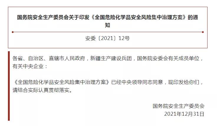 全國(guó)危險(xiǎn)化學(xué)品安全風(fēng)險(xiǎn)集中治理方案 危險(xiǎn)化學(xué)品涉及行業(yè)領(lǐng)域廣、鏈條長(zhǎng),安全風(fēng)險(xiǎn)大、治理任務(wù)重。黨中央、國(guó)務(wù)院高度重視,習(xí)近平總書記多次作出重要批示,最近又專門作出重要指示。為認(rèn)真抓好貫徹落實(shí),有效防范化解危險(xiǎn)化學(xué)品重大安全風(fēng)險(xiǎn),保障人民群眾生命財(cái)產(chǎn)安全和社會(huì)穩(wěn)定,按照黨中央、國(guó)務(wù)院領(lǐng)導(dǎo)同志批示要求,結(jié)合深入貫徹落實(shí)中共中央辦公廳、國(guó)務(wù)院辦公廳《關(guān)于全面加強(qiáng)危險(xiǎn)化學(xué)品安全生產(chǎn)工作的意見》(以下簡(jiǎn)稱兩辦《意見》)和國(guó)務(wù)院安委會(huì)《全國(guó)安全生產(chǎn)專項(xiàng)整治三年行動(dòng)計(jì)劃》(以下簡(jiǎn)稱《三年行動(dòng)計(jì)劃》),制定本方案。 一、總體要求 以習(xí)近平新時(shí)代中國(guó)特色社會(huì)主義思想為指導(dǎo),深入貫徹習(xí)近平總書記關(guān)于安全生產(chǎn)重要論述,堅(jiān)持人民至上、生命至上,強(qiáng)化底線思維和紅線意識(shí),統(tǒng)籌好發(fā)展和安全,深入分析研判、緊緊扭住抓牢貫徹落實(shí)兩辦《意見》和《三年行動(dòng)計(jì)劃》過程中發(fā)現(xiàn)的突出矛盾以及國(guó)內(nèi)外典型事故暴露出的重大風(fēng)險(xiǎn)隱患,全面調(diào)動(dòng)各方力量,利用一年時(shí)間集中治理,進(jìn)一步推動(dòng)各地區(qū)、各有關(guān)部門和單位樹牢安全發(fā)展理念,加大安全投入,壓實(shí)安全責(zé)任,堅(jiān)持嚴(yán)格監(jiān)管執(zhí)法與強(qiáng)化信息技術(shù)支撐并重,完善危險(xiǎn)化學(xué)品安全風(fēng)險(xiǎn)防范化解工作機(jī)制,務(wù)必做到重大風(fēng)險(xiǎn)隱患排查見底、防范治理措施落實(shí)到位,真正從根本上消除事故隱患、從根本上解決問題,切實(shí)把確保人民生命安全放在第一位落到實(shí)處,堅(jiān)決防范遏制危險(xiǎn)化學(xué)品重特大事故,為迎接黨的二十大勝利召開營(yíng)造安全穩(wěn)定環(huán)境。 二、重點(diǎn)治理的突出問題和重大安全風(fēng)險(xiǎn) 各地區(qū)、各有關(guān)部門和單位要認(rèn)真梳理兩辦《意見》和《三年行動(dòng)計(jì)劃》重點(diǎn)任務(wù)落實(shí)情況,深刻吸取典型事故教訓(xùn),采取有針對(duì)性措施,對(duì)照以下兩大類突出問題和四個(gè)環(huán)節(jié)的重大安全風(fēng)險(xiǎn)進(jìn)行重點(diǎn)排查。 (一)安全發(fā)展理念不牢問題。一是學(xué)習(xí)貫徹習(xí)近平總書記關(guān)于安全生產(chǎn)重要論述不深入不扎實(shí),沒有分析研判本地區(qū)危險(xiǎn)化學(xué)品重大安全風(fēng)險(xiǎn),對(duì)新情況、新問題不了解、不掌握。二是沒有統(tǒng)籌好發(fā)展和安全兩件大事,只重發(fā)展不顧安全,在不具備條件的情況下盲目發(fā)展高危工藝的化工項(xiàng)目,淘汰落后生產(chǎn)能力、推動(dòng)化工產(chǎn)業(yè)升級(jí)措施不力、進(jìn)展遲緩。三是源頭治理不嚴(yán)不實(shí),化工產(chǎn)業(yè)轉(zhuǎn)移安全風(fēng)險(xiǎn)在一些地區(qū)加速集聚,風(fēng)險(xiǎn)管控能力不足,導(dǎo)致事故多發(fā),近一年全國(guó)發(fā)生的12起化工較大事故中有7起發(fā)生在異地轉(zhuǎn)移企業(yè)。一些地區(qū)沒有對(duì)危險(xiǎn)化學(xué)品企業(yè)全面開展安全分類整治,非法違法“小化工”整治不認(rèn)真不徹底。四是安全投入不足,一些地區(qū)涉及“兩重點(diǎn)一重大”(重點(diǎn)監(jiān)管的危險(xiǎn)化工工藝、重點(diǎn)監(jiān)管的危險(xiǎn)化學(xué)品和危險(xiǎn)化學(xué)品重大危險(xiǎn)源)的化工企業(yè)沒有按期完成泄漏檢測(cè)報(bào)警、緊急切斷、自動(dòng)化控制和安全儀表系統(tǒng)的裝備使用,自動(dòng)消防設(shè)施功能失靈,消防基礎(chǔ)設(shè)施設(shè)備及管道老化。五是應(yīng)急處置力量不足,部分大型企業(yè)未按要求建設(shè)企業(yè)專職消防隊(duì),部分企業(yè)沒有建設(shè)相關(guān)工藝處置隊(duì)和應(yīng)急處置隊(duì)。 (二)安全生產(chǎn)責(zé)任不落實(shí)問題。一是安全監(jiān)管執(zhí)法力量薄弱,一些危險(xiǎn)化學(xué)品重點(diǎn)地區(qū)沒有按照兩辦《意見》要求配齊配強(qiáng)專業(yè)執(zhí)法力量,危險(xiǎn)化學(xué)品安全監(jiān)管執(zhí)法人員中具有相關(guān)專業(yè)學(xué)歷、職業(yè)資格和實(shí)踐經(jīng)驗(yàn)的不到三分之一,不懂不會(huì)的問題沒有得到根本改變。二是按照“三個(gè)必須”要求已經(jīng)明確的部門安全監(jiān)管責(zé)任落實(shí)不到位,甚至有的將自身的業(yè)務(wù)工作與安全割裂開來,安全風(fēng)險(xiǎn)因素考慮不足,導(dǎo)致漏管失控。三是一些企業(yè)安全生產(chǎn)和消防安全主體責(zé)任不落實(shí),風(fēng)險(xiǎn)辨識(shí)和管控制度執(zhí)行不嚴(yán),未按規(guī)定配備化工專業(yè)技術(shù)團(tuán)隊(duì)、高風(fēng)險(xiǎn)崗位操作人員和消防控制室值班人員,安全責(zé)任落實(shí)不到基層班組,一些重大危險(xiǎn)源包保責(zé)任人只掛名不履職,一些消防控制室值班人員未取得自動(dòng)消防設(shè)施操作員證。四是信息化監(jiān)控手段嚴(yán)