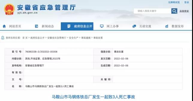 熱鬧的春節(jié)假期結(jié)束了,令人沒想到的是假期最后一天,安徽一煉鐵廠突發(fā)事故,致4人不幸遇難。 復(fù)工安全千萬不能兒戲! 據(jù)安徽省應(yīng)急管理廳通報,2月6日上午,安徽馬鞍山市馬鋼煉鐵總廠一料倉發(fā)生事故,致4人不幸遇難、1人受傷。 2月6日上午10時20分左右,馬鋼煉鐵總廠區(qū)域內(nèi)一料倉本體漏灰,6名工作人員進行搶修作業(yè)時,灰斗本體突然開裂,大量脫硫灰冒出。工作人員被從四樓平臺沖至二樓平臺,4人送醫(yī)搶救,其中3人搶救無效死亡,1人生命體征平穩(wěn);另1人手部輕微灼傷;1人被掩埋,17時被搜救出已無生命體征。 目前,事故原因正在調(diào)查分析中。