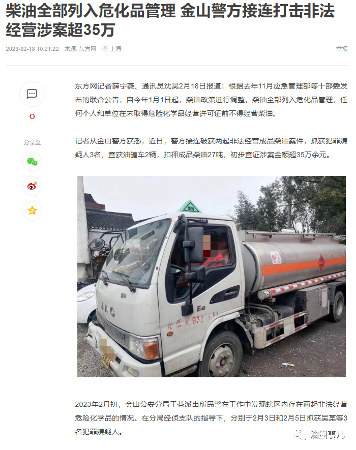 案例一:近日,長沙市天心區(qū)應急管理局接到群眾舉報,在暮云街道蓮河村蓮河加油站正后面100米處一板房內(nèi),儲存了危險化學品。該局立即聯(lián)合組織公安、街道等部門上門核實,發(fā)現(xiàn)龔某某為節(jié)約成本,在自建板房油罐內(nèi)儲存2.88噸柴油,供自家車隊使用。臨邊就是中石化蓮河加油站,一旦出現(xiàn)泄漏事故,易造成人員傷害和環(huán)境傷害,存在重大的安全隱患。天心區(qū)應急管理局當即對危險化學品進行了扣押,消除安全隱患。 目前,天心區(qū)應急管理局已經(jīng)對龔某某立案調(diào)查,龔某某未將危險化學品儲存在專用倉庫內(nèi),違反了《危險化學品安全管理條例》相關規(guī)定,執(zhí)法人員依據(jù)《危險化學品安全管理條例》和《安全生產(chǎn)行政執(zhí)法與刑事司法銜接工作辦法》(應急〔2019〕54 號)相關規(guī)定,對龔某某作出罰款60000元的行政處罰,并移交公安部門進行行刑銜接。 案例二:3月3日下午,根據(jù)群眾舉報,長沙市開福區(qū)應急管理局聯(lián)合青竹湖街道對湖南某公司開展危險化學品“打非治違”執(zhí)法檢查行動。該公司位于新港路80號,現(xiàn)場設置了地下儲油罐1個、加油機1臺。公司負責人表示,儲罐內(nèi)儲存的0號車用柴油主要用于公司內(nèi)部車輛加油使用。執(zhí)法人員檢查發(fā)現(xiàn)地下儲罐全部浸泡水中,銹蝕嚴重,且未采取任何安全防范措施,存在巨大安全隱患。 該公司涉嫌違反《危險化學品安全管理條例》第二十四條第一款“危險化學品應當儲存在專用倉庫、專用場地或者專用儲存室(以下統(tǒng) 稱專用倉庫)內(nèi),并由專人負責管理的規(guī)定”。執(zhí)法人員依法對該地下儲油罐進行查封,扣押柴油4.6噸。目前案件正在進一步調(diào)查中。2023年1月1日起,所有柴油列為《危險化學品目錄》,不再區(qū)分閃點。為打好安全生產(chǎn)攻堅仗,開福區(qū)危化煙花工貿(mào)專委會深入推進柴油專項整治工作,組織各街道、各部門全面摸排,特別是物流運輸企業(yè)、渣土公司、攪拌站、建設工地、廢鐵站等用油量較大的單位,嚴禁違規(guī)設置露天罐、埋地罐等非法儲油設施;交警、交通部門將加大對非法改裝廂式貨車、面包車非法運輸柴油的打擊力度;公安機關積極配合辦理行刑銜接案件。 案例三:2023年2月初,上海金山公安分局干巷派出所民警在工作中發(fā)現(xiàn)轄區(qū)內(nèi)存在兩起非法經(jīng)營危險化學品的情況。在分局經(jīng)偵支隊的指導下,分別于2月3日和2月5日抓獲吳某等3名犯罪嫌疑人。經(jīng)查,犯罪嫌疑人吳某等3人在已申報但還未取得危險化學品經(jīng)營許可證的情況下,長期從事柴油銷售,他們從正規(guī)渠道以“批發(fā)價”購入柴油,銷售的柴油主要用于工地施工設備以及農(nóng)場農(nóng)用機械等,至案發(fā)已非法銷售柴油50余噸,涉案金額超35萬元。 目前,犯罪嫌疑人吳某、尹某、艾某3人因涉嫌非法經(jīng)營罪被公安機關依法采取刑事強制措施,案件正在進一步審理中。根據(jù)網(wǎng)絡上的政策解讀,柴油全部列入危化品管理后,將嚴厲打擊一些個人或企業(yè)利用內(nèi)部自用加油站的名義(比如物流公司內(nèi)部車輛加油)來打擦邊球進行柴油對外經(jīng)營或貿(mào)易的行為,柴油納入;饭芾砗,若無證經(jīng)營或儲存,將面臨刑法的危險作業(yè)罪、非法經(jīng)營罪的責任追究。此外,按照治安管理處罰法相關要求,對加油站對外銷售打桶或散裝柴油有可能更加嚴格,對于偷盜柴油的行為,處罰會更加嚴重。 ;方榻B 2022年11月7日,應急管理部等10部門發(fā)布關于調(diào)整《危險化學品目錄(2015版)》的公告,將“1674柴油[閉杯閃點≤60℃]”調(diào)整為“1674柴油”,新規(guī)于2023年1月1日起施行。危險化學品,是指具有毒害、腐蝕、爆炸、燃燒、助燃等性質(zhì),對人體、設施、環(huán)境具有危害的劇毒化學品和其他化學品。一旦儲存運輸不當,將會嚴重危害影響人民的生命安全和環(huán)境安全。危險化學品對于儲存場地有特殊的要求,應與其他貨物分開儲存,儲存在專用倉庫內(nèi),并有專人負責管理。 溫馨提醒 企業(yè)在儲存和使用危險化學品時,要對危險化學品進行管理,采取安全措施。危險化學品必須存放到專用倉庫,倉庫應建在企業(yè)單位區(qū)域邊緣且保證有安全的防火間距。倉庫必須具有良好的通風、隔熱條件,配備降溫、防潮、防汛、防雷等設施。倉庫的設施需要定期由專人檢查登記。倉庫內(nèi)應安裝自動監(jiān)測和火災報警系統(tǒng)。倉庫內(nèi)設施皆需要防爆功能,比如防爆燈、防爆風扇、防爆開關等。庫房門應采用外開式防火門,且有良好接地。倉庫地面需采用不燃燒且易洗的地坪。倉庫內(nèi)地坪需比外面地坪高至少0.2m,倉庫門口應有斜坡。儲存易燃易爆危險化學品的場所應符合防火防爆安全規(guī)定,區(qū)域內(nèi)嚴禁煙火和明火。 危險化學品入庫時應嚴格檢驗物品質(zhì)量、數(shù)量、包裝等情況。庫房的溫度、濕度應嚴格控制,經(jīng)常檢查,發(fā)現(xiàn)變化及時調(diào)整。容易發(fā)生化學反應或滅火方式不同的各類危險化學品不得混儲混存。對遺留在地上和墊倉板上的危險化學品,必須及時清除,保持庫房清潔。 倉庫內(nèi)需要貼有各類標識,注明化學品名稱規(guī)格和提