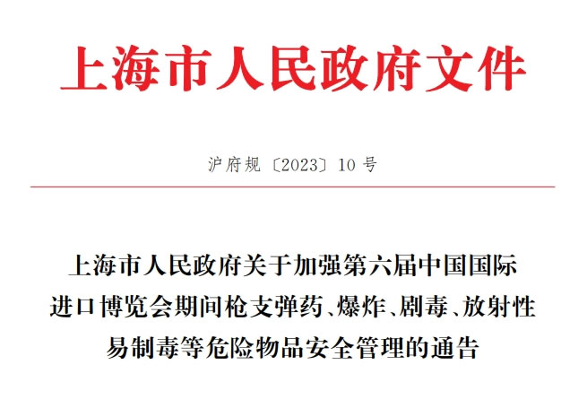 2023年11月5日至11月10日,上海舉辦第六屆中國國際進口博覽會,期間將對易制毒化學(xué)品及運輸危險品車輛實施嚴格管控。 一、2023年10月25日0時至11月12日24時,停止民用槍支彈藥配售、配購(含行政審批)。11月4日0時至11月12日24時,停止射擊競技體育運動單位、營業(yè)性射擊場等民用槍支使用單位實彈射擊訓(xùn)練、經(jīng)營活動,停止影視制作單位道具槍拍攝活動,所有民用槍支彈藥入庫封存;停止爆破作業(yè)單位實施爆破作業(yè)項目。 二、2023年11月1日0時至11月12日24時,車輛運輸危險物品具有下列情形之一的,應(yīng)當委托具有武裝押運資質(zhì)的保安公司進行押運: (一)在本市范圍內(nèi),運輸槍支彈藥、民用爆炸物品、劇毒化學(xué)品、一類放射性物品的; (二)在嘉松南路-嘉松中路-G2京滬高速-S20外環(huán)線-漕寶路-滬松公路-泗陳公路-嘉松南路合圍區(qū)域內(nèi),運輸二、三類放射性物品(醫(yī)療用短壽命放射性藥品除外),以及鹽酸、硫酸、丙酮、高錳酸鉀四種易制毒化學(xué)品中一種或幾種的。 三、2023年11月1日0時至11月12日24時,運輸危險物品車輛進出本市的,應(yīng)當從14個指定道口通行(洋橋公安檢查站、G15朱橋公安檢查站、葛隆公安檢查站、安亭公安檢查站、G2京滬公安檢查站、大盈公安檢查站、西岑公安檢查站、G50滬渝公安檢查站、G60滬昆公安檢查站、楓涇公安檢查站、亭楓公安檢查站、G15滬浙公安檢查站、新聯(lián)公安檢查站、東海大橋公安檢查站)。