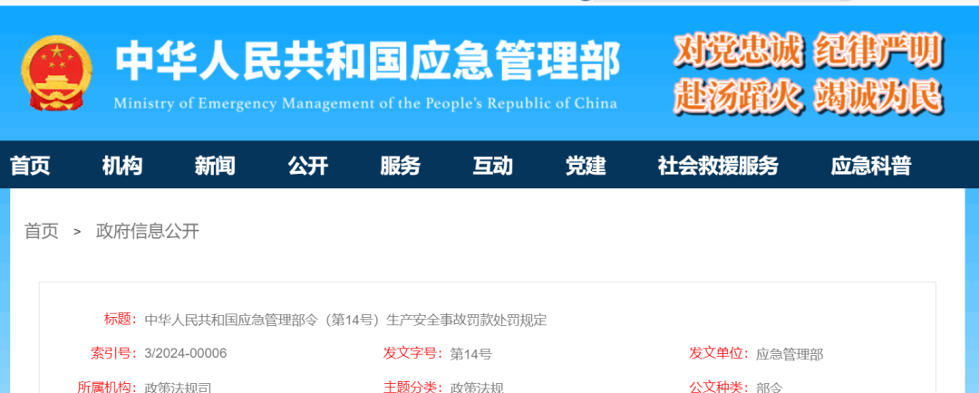 第14號(hào)生產(chǎn)安全事故罰款處罰規(guī)定中華人民共和國(guó)應(yīng)急管理部令第14號(hào)《生產(chǎn)安全事故罰款處罰規(guī)定》已經(jīng)2023年12月25日應(yīng)急管理部第32次部務(wù)會(huì)議審議通過,現(xiàn)予公布,自2024年3月1日起施行。部長(zhǎng) 王祥喜2024年1月10日