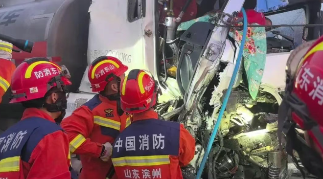 危險!山東油罐車與半掛車相撞,司機(jī)、押運(yùn)員被困!