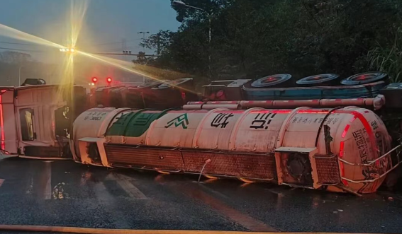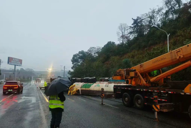 11月3日06時04分,湖南湘潭市消防救援支隊接到報警稱湘潭縣018縣道(往楊家橋收費站方向)一罐車發(fā)生側翻泄漏,車上載有濃度為32%的液堿。指揮中心立即調(diào)派金桂路站共3輛消防車、12名指戰(zhàn)員趕赴現(xiàn)場,同時聯(lián)動應急、交通、環(huán)保公安等部門協(xié)同處置。06時22分,消防救援力量抵達事故地點。 經(jīng)偵查發(fā)現(xiàn),事故車輛為一輛槽罐車,車載約33噸、濃度32%的液堿,行駛過程中發(fā)生側翻,目前罐頂入孔處出現(xiàn)少量泄漏。根據(jù)現(xiàn)場情況,帶隊指揮員立即組織力量在泄漏點設置水槍,對泄漏的液堿構筑圍堤封堵和封堵下水道,阻止泄漏的液堿進一步向外擴散,并迅速利用堵漏器材對泄漏點進行封堵。 同時,經(jīng)過現(xiàn)場指揮部及相關專家的評估決策,決定采用對罐體進行切割來輸轉倒罐的方案,進行本次事故處置。9時05分,救援人員使用自帶防爆轉料泵、軟管等裝備開始實施倒罐作業(yè)。經(jīng)過近4個小時的持續(xù)奮戰(zhàn),9時51分,救援人員成功將事故車槽罐內(nèi)液堿轉移至備用槽罐,順利完成倒灌作業(yè)。經(jīng)反復檢測確認,現(xiàn)場無危險后,全體人員安全撤離。